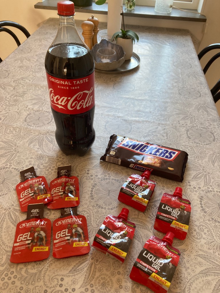 I let people know what I am planning in case anyone wanted to join me through out the day. I get my supplies ready on Saturday. I make ice coffee, release the CO2 from a coke so it is more like sugar water than soda the next day. On top of what you see here I had a bag of cinnamon buns, a Red Bull and two protein drinks.